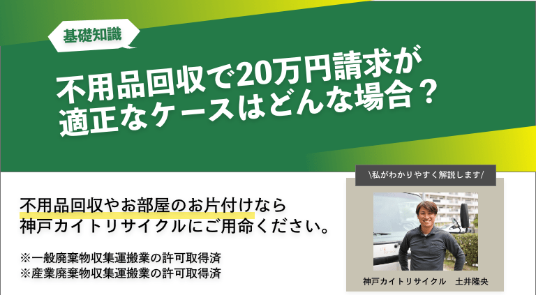 不用品回収・買取を行う神戸カイトリサイクルが、不用品回収で20万円請求が適正となる具体的なケースと、高額請求を避けるためのポイントを詳しく解説いたします。
